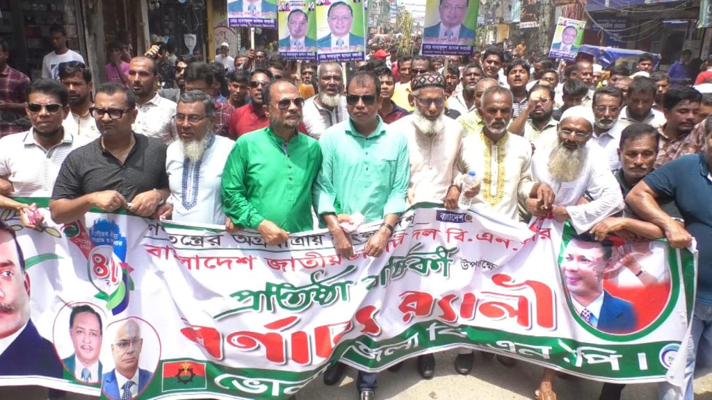 হাজার হাজার নেতাকর্মীর অংশগ্রহণে বিএনপি’র নির্ধারিত সংগীত বাজানোর মধ্য দিয়ে শহীদ প্রেসিডেন্ট জিয়াউর রহমান, সাবেক প্রধানমন্ত্রী বেগম খালেদা জিয়া ও বিএনপি’র ভারপ্রাপ্ত চেয়ারম্যান তারেক রহমানের ছবি সম্বলিত ব্যানার ফেস্টুন নিয়ে স্লোগানের মুখরিত করে পুরো ভোলা শহর।